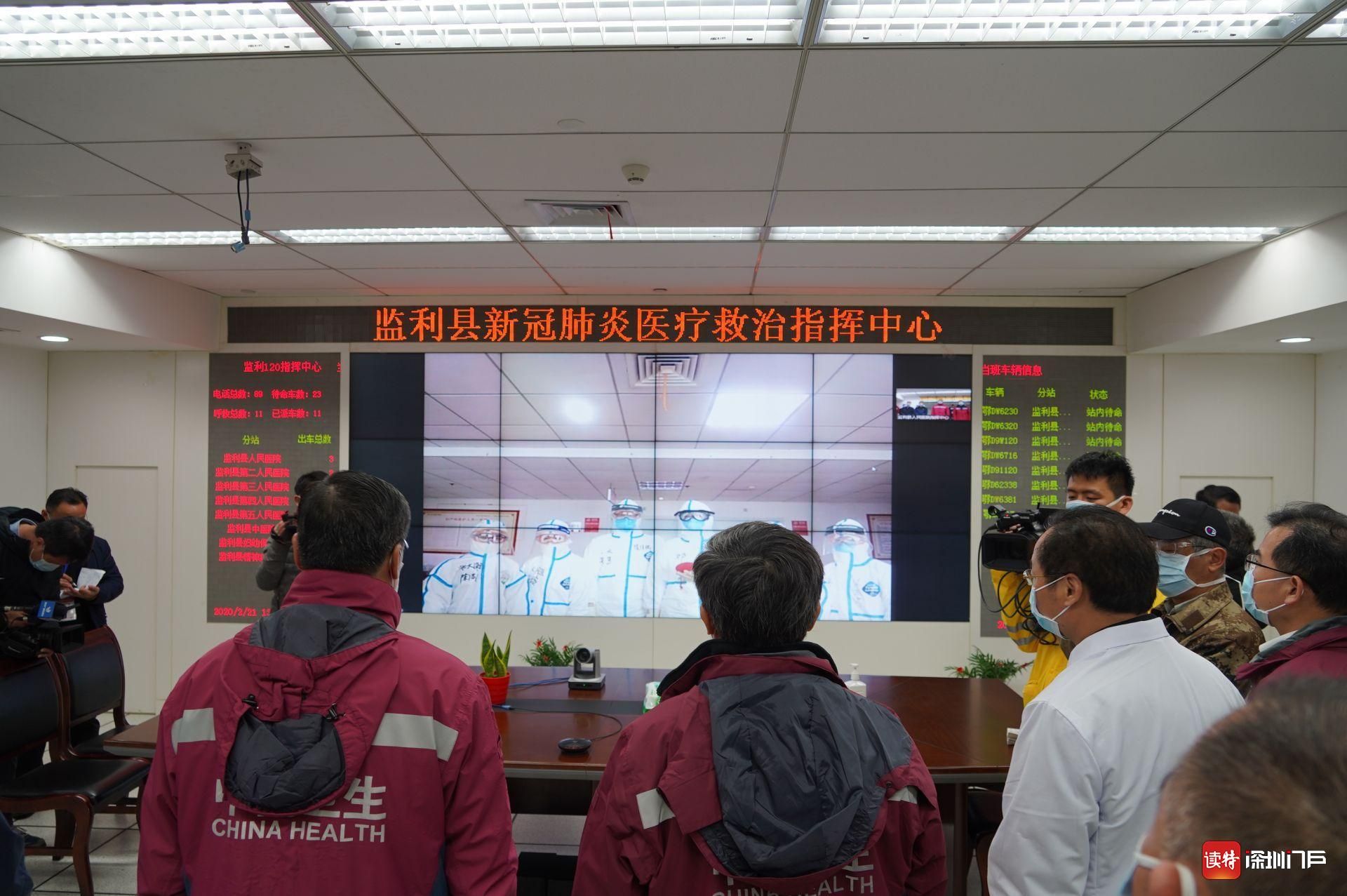 2月21日,監(jiān)利縣人民醫(yī)院指揮中心,廣東省醫(yī)療隊(duì)前指領(lǐng)導(dǎo)與縣中醫(yī)院ICU里的廣東醫(yī)療隊(duì)隊(duì)員進(jìn)行視頻連線。