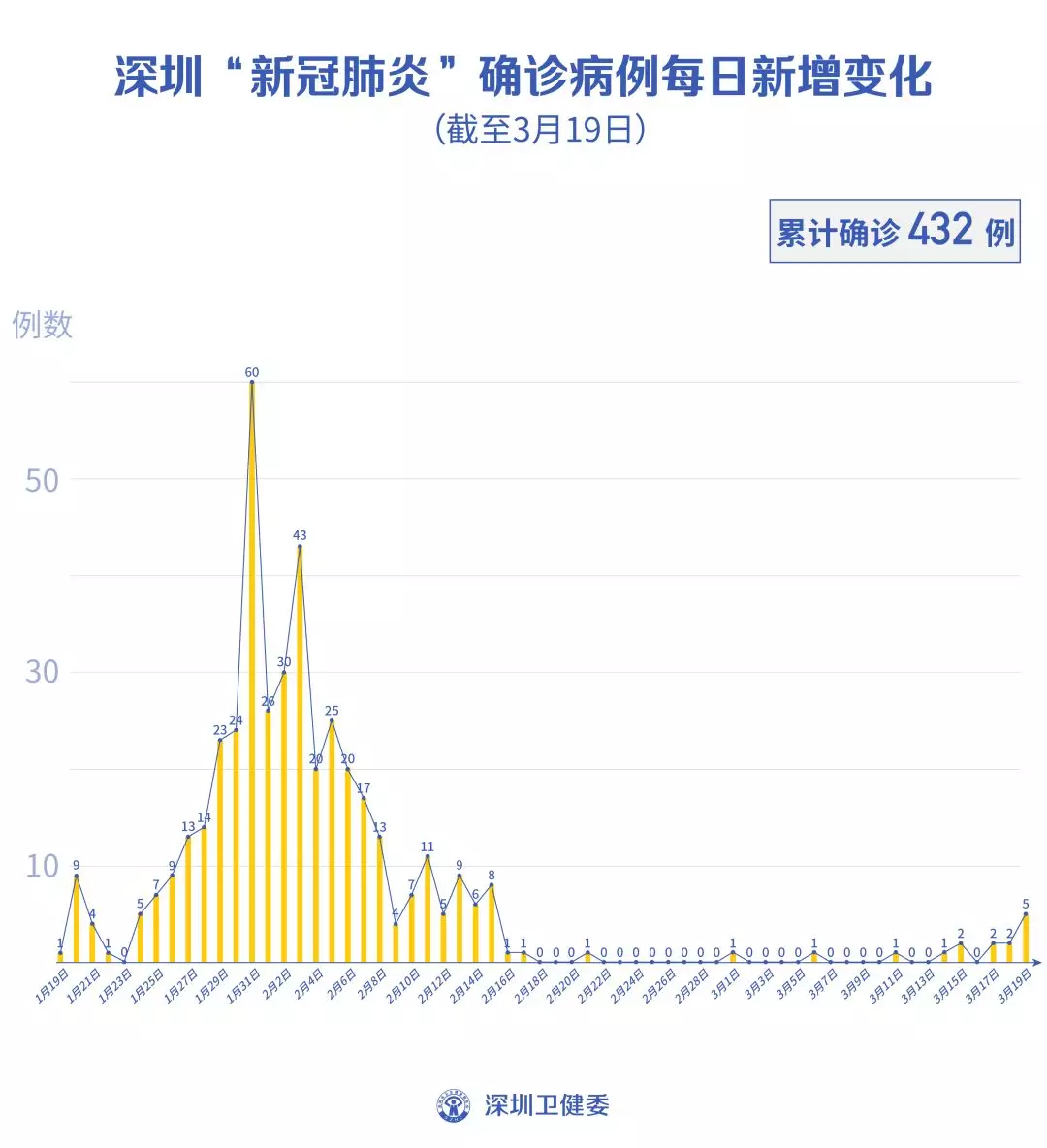 截至3月19日24時,深圳累計報告“新冠肺炎”病例432例。3月19日當天新增5例,出院2例。
