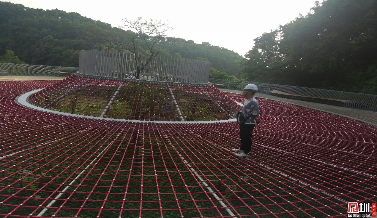 探橋的設(shè)計主題是生態(tài),強調(diào)人和水的親近。利用山體地形高差,修建環(huán)形棧道,通達(dá)低洼處的水潭,形成了與眾不同的親水體驗,同時,中間網(wǎng)紅爬網(wǎng)與橋體相連,打造具有探索趣味的休憩空間。