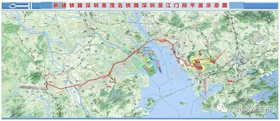 中段經(jīng)由南沙、中山,溝通珠澳,西至江門樞紐,西端在江門樞紐組合銜接多條高鐵,輻射粵西海南及西南廣大片區(qū)。