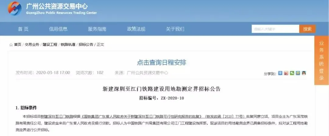 3月18日,《新建深圳至江門鐵路建設(shè)用地勘測(cè)定界招標(biāo)公告》在廣州公共資源交易中心網(wǎng)站正式發(fā)布。