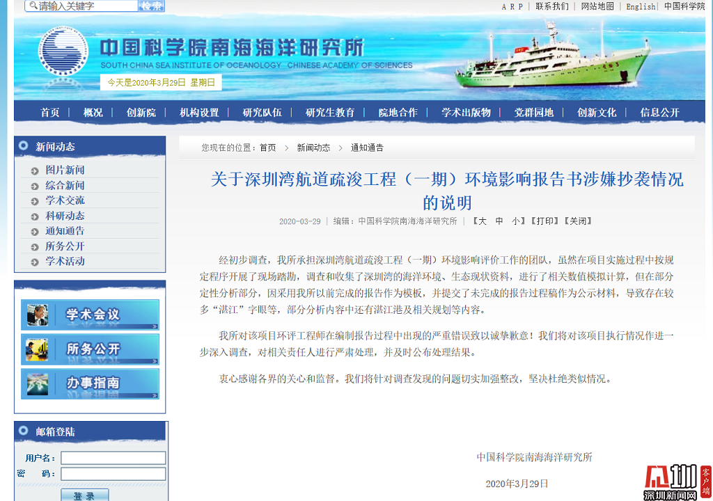 見圳客戶端·深圳新聞網(wǎng)2020年3月29日(見圳客戶端、深圳新聞網(wǎng)記者 鐘鴻冰)3月29日,中國科學(xué)院南海海洋研究所在官網(wǎng)發(fā)布說明稱:深圳灣航道疏浚工程(一期)環(huán)境影響評價工作雖按規(guī)定進(jìn)行了現(xiàn)場踏勘,調(diào)查并收集了有關(guān)資料等環(huán)節(jié),但因采用其以前的報告作為模板,并將未完成的報告作為公示材料,導(dǎo)致公示的環(huán)評報告中出現(xiàn)多處錯誤。南海海洋研究所表示,將對相關(guān)責(zé)任人嚴(yán)肅處理并公示處理結(jié)果。