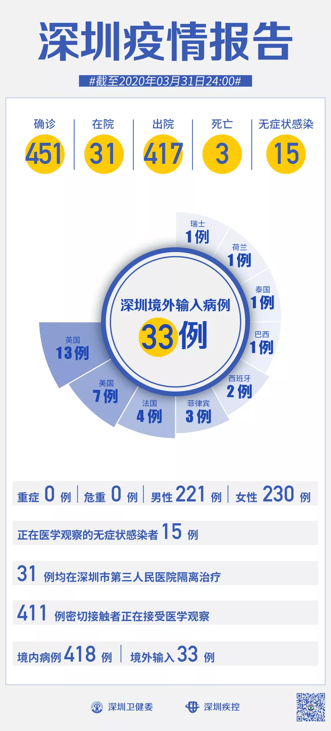 截至3月31日24時,深圳累計報告新冠肺炎病例451例。3月31日當天新增境內病例1例、無癥狀感染者1例。 【境內病例】:新增1例湖北返深確診病例,出院1例,累計報告境內病例418例。 【境外輸入】:當日無新增病例,累計報告境外輸入病例33例。 【無癥狀感染者】:新增1例湖北返深無癥狀感染者。全市尚在醫(yī)學觀察的無癥狀感染者15例,其中境外輸入9例。 累計報告確診病例中,男性221例、女性230例。 目前,死亡3例,累計出院417例。31例確診病例均在深圳市第三人民醫(yī)院隔離治療。 411名密切接觸者正在接受醫(yī)學觀察。 無癥狀感染者7問7答 01.什么是新型冠狀病毒無癥狀感染者? 新冠病毒無癥狀感染者(以下簡稱無癥狀感染者)是指無相關臨床癥狀,如發(fā)熱、咳嗽、咽痛等可自我感知或可臨床識別的癥狀與體征,但呼吸道等標本新冠病毒病原學檢測陽性者。無癥狀感染者可分為兩種情形: 一是感染者核酸檢測陽性,經過14天潛伏期的觀察,均無任何可自我感知或可臨床識別的癥狀與體征,始終為無癥狀感染狀態(tài); 二是感染者核酸檢測陽性,采樣時無任何可自我感知或可臨床識別的癥狀與體征,但隨后出現(xiàn)某種臨床表現(xiàn),即處于潛伏期的“無癥狀感染”狀態(tài)。 02.無癥狀感染者有無傳染性? 根據國家和部分省份開展的密切接觸者監(jiān)測數(shù)據,無癥狀感染者的密切接觸者存在二代病例續(xù)發(fā),流行病學調查中發(fā)現(xiàn)個別由無癥狀感染者導致的聚集性疫情,有小樣本量的研究顯示無癥狀感染者呼吸道樣本中的病毒載量與確診病例沒有太大差異。 綜合目前的監(jiān)測和研究,無癥狀感染者存在傳染性,但其傳染期長短、傳染性強弱、傳播方式等尚需開展進一步科學研究。 部分專家認為鑒于無癥狀感染者的呼吸道標本能檢出病原核酸,但由于無咳嗽、打噴嚏等臨床癥狀,病原排出體外引起傳播的機會較確診病例相對少一些。 03.我國關于新型冠狀病毒無癥狀感染者的防控要求是什么? 國家衛(wèi)生健康委在1月28日發(fā)布《新冠病毒感染的肺炎防控方案》(第三版)中就將新型冠狀病毒無癥狀感染者納入防控管理,在其后的修訂過程中均對無癥狀感染者的報告、管理等提出了明確具體的要求。各級各類醫(yī)療衛(wèi)生機構發(fā)現(xiàn)無癥狀感染者,應于2小時內進行網絡直報。 縣(區(qū))級疾控機構接到無癥狀感染者報告后,24小時內完成個案調查,并及時進行密切接觸者登記,將個案調查表或調查報告及時通過傳染病報告管理信息系統(tǒng)進行上報。 無癥狀感染者應集中隔離14天,原則上集中隔離滿14天且兩次連續(xù)標本核酸檢測陰性者(采樣時間至少間隔24小時)可解除隔離; 如果核酸檢測仍為陽性者,則繼續(xù)隔離醫(yī)學觀察。 隔離醫(yī)學觀察期間如出現(xiàn)臨床表現(xiàn),應及時轉歸為確診病例,進行規(guī)范治療。 無癥狀感染者密切接觸者也要進行14天的集中隔離醫(yī)學觀察。 04.無癥狀感染者通過什么途徑發(fā)現(xiàn)?截至目前我國發(fā)現(xiàn)了多少例無癥狀感染者? 目前我們主要通過以下途徑主動發(fā)現(xiàn)無癥狀感染者: 一是對新型冠狀病毒肺炎病例的密切接觸者開展醫(yī)學觀察期間的主動檢測; 二是在聚集性疫情調查中開展的主動檢測; 三是在新型冠狀病毒肺炎病例的傳染源追蹤過程中對暴露人群主動檢測; 四是對部分有境內外新型冠狀病毒肺炎病例持續(xù)傳播地區(qū)的旅行史和居住史人員開展主動檢測。 05.如何做好無癥狀感染者的風險評估及其防控? 無癥狀感染者存在著傳播風險。 一是傳播的隱匿性。由于無癥狀感染者無任何明顯的癥狀與體征,其在人群中難以被發(fā)現(xiàn),其導致的傳播也難以預防。 二是癥狀的主觀性。癥狀輕微或不典型者可能認為自己沒有感染新冠病毒,不主動去醫(yī)療機構就診,在日常的診療工作中難以被發(fā)現(xiàn)。 三是發(fā)現(xiàn)的局限性。由于存在檢測窗口期,采用核酸檢測和血清學檢測方法難以發(fā)現(xiàn)全部無癥狀感染者,現(xiàn)有的無癥狀感染者主要是通過病例的密切接觸者主動篩查、感染來源調查、聚集性疫情調查和對高風險地區(qū)人員的主動檢測發(fā)現(xiàn)的,尚有部分無癥狀感染者難以被發(fā)現(xiàn)。 為此,要突出做好無癥狀感染者監(jiān)測,有針對性加大篩查力度,將檢測范圍擴大至已發(fā)現(xiàn)病例和無癥狀感染者的密切接觸者、重點地區(qū)和重點人群等。一旦發(fā)現(xiàn)無癥狀感染者,要立即按“四早”要求,嚴格集中隔離和醫(yī)學觀察,對密切接觸者也要實施隔離醫(yī)學觀察。 由于部分無癥狀感染者始終無癥狀,實際防控工作中無法將發(fā)現(xiàn)和隔離無癥狀感染者作為主導措施。因此我們仍將繼續(xù)著重于及時發(fā)現(xiàn)隔離確診患者,并做好密切接觸者管理。 我國經驗表明,做好確診病例的及時發(fā)現(xiàn)和隔離,并適度采取減少人際接觸等措施,可以基本阻斷疫情傳播。 06.下一步如何做好無癥狀感染者防控管理? 一是完善防治方案。 抓緊在疫情重點地區(qū)抽取一定比例樣本,開展無癥狀感染者調查和流行病學分析研究,完善防控措施,修訂完善防控方案和診療方案,科學應對無癥狀感染者帶來的感染風險,遏制可能形成新的疫情傳播。 二是加大篩查監(jiān)測。 有針對性加大