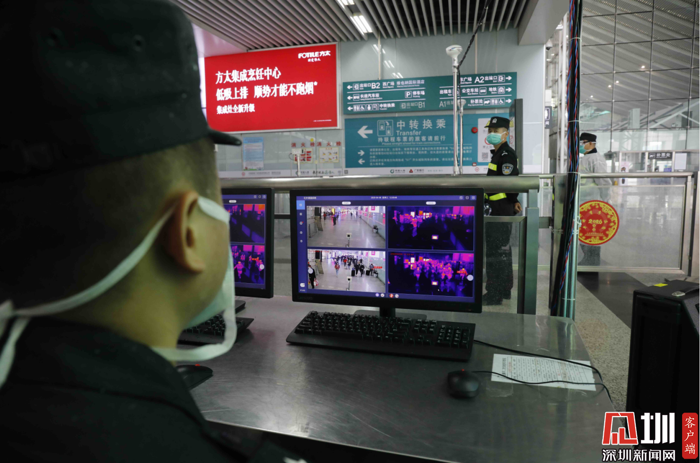 深圳北西廣場出口處,安檢人員正在檢測旅客體溫。