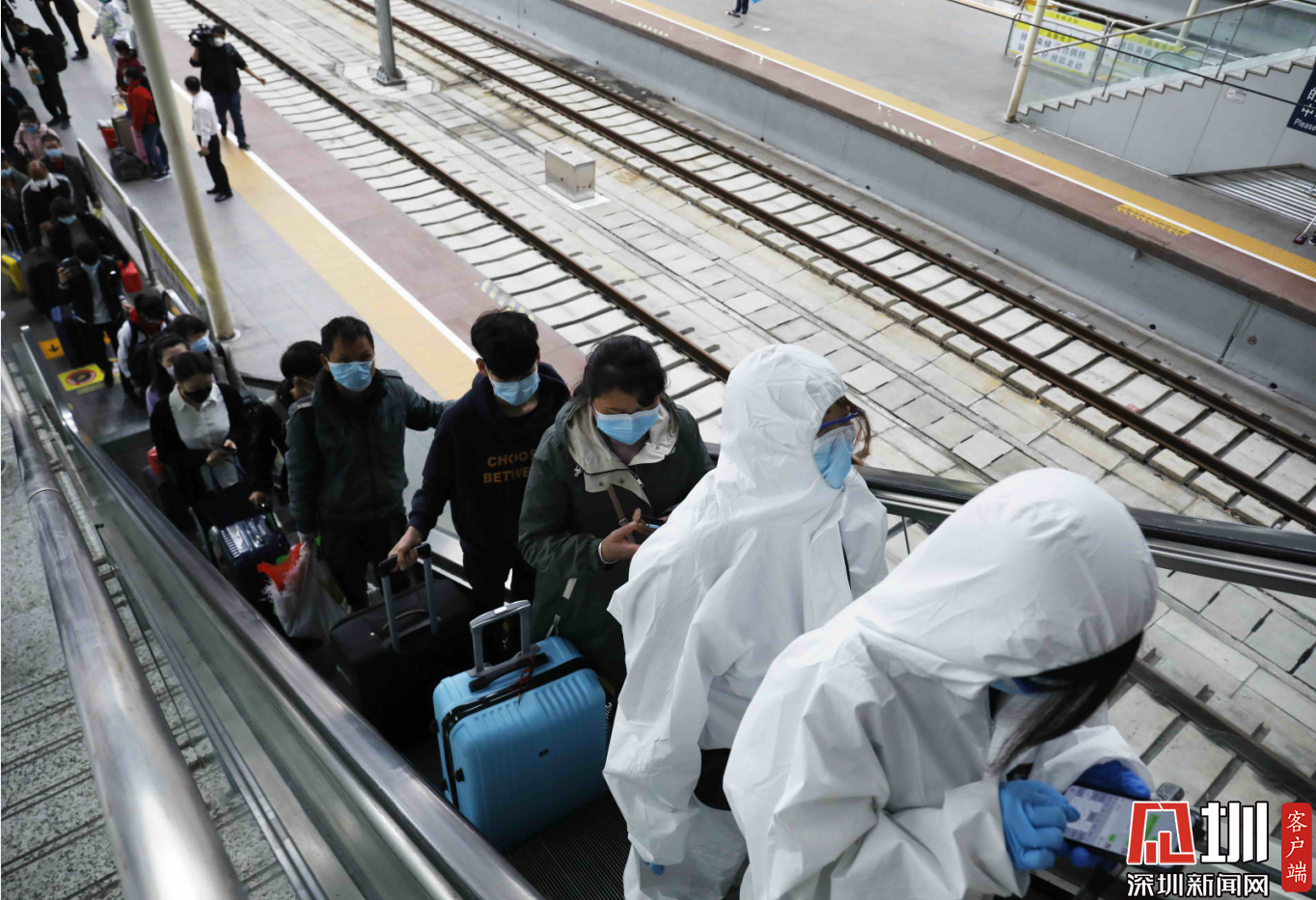 兩位穿著防護(hù)衣的旅客正在出站。