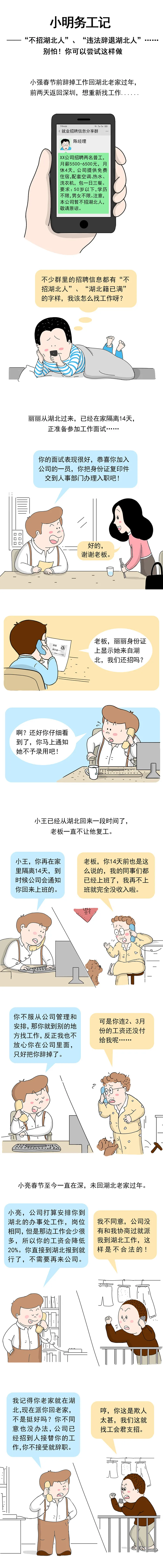 目前,仍有小部分湖北職工在深務(wù)工時(shí)遭到了如漫畫(huà)所描繪的就業(yè)歧視,我們要堅(jiān)決反對(duì)就業(yè)環(huán)境中歧視湖北人的行為!