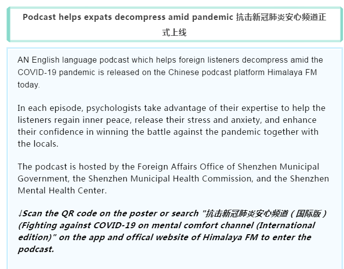 在疫情面前,每一份信念都意義重大,每一個希望都影響深遠(yuǎn)。4月11日,抗擊新冠肺炎安心頻道(國際版)在喜馬拉雅 APP正式上線。該欄目在深圳市委組織部的指導(dǎo)下,由深圳市外辦攜手深圳市衛(wèi)健委、深圳市精神衛(wèi)生中心、深圳市國際交流合作基金會聯(lián)合出品,由深圳晚報和深圳喜馬拉雅共同承制。據(jù)悉,抗擊新冠肺炎安心頻道(國際版)是深圳市外辦首次聯(lián)合多部門協(xié)作,共同出品的全英文音頻欄目,也是繼"抗擊新型肺炎安心手冊音頻版"推出以來的又一大創(chuàng)新。該欄目的推出體現(xiàn)了深圳對中外居民的人文關(guān)懷,也展現(xiàn)了深圳作為國際化城市的溫暖大愛。