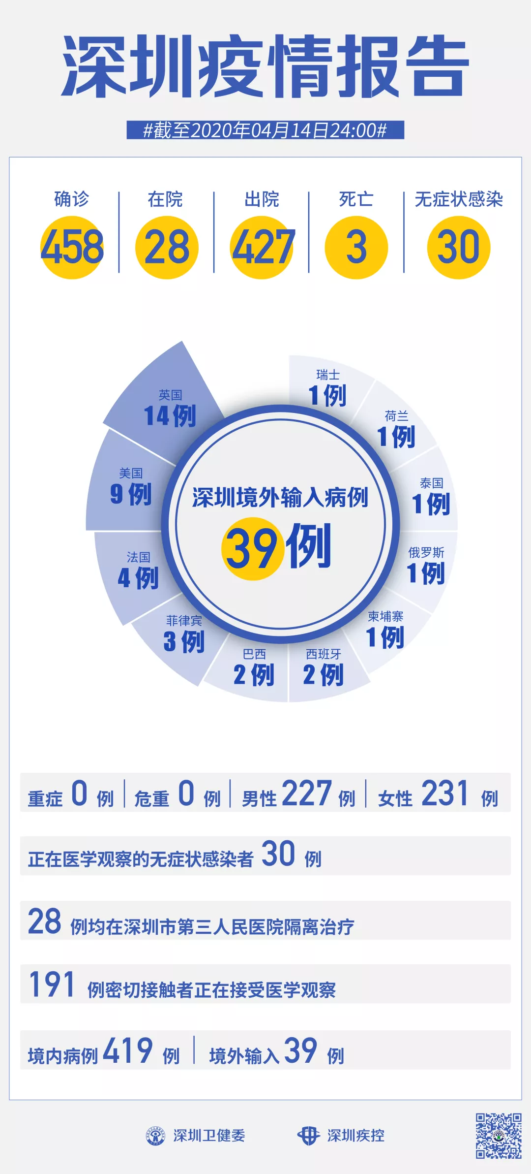 截至4月14日24時,深圳累計報告新冠肺炎病例458例。4月14日當(dāng)天新增出院3例。