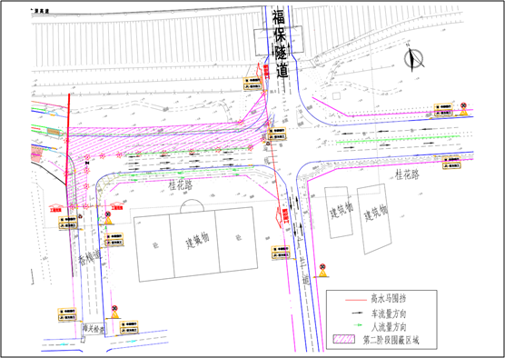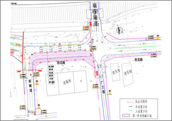 第一階段:對(duì)桂花路(福保隧道-香樟道段)南半幅(靠紅樹(shù)福苑側(cè))進(jìn)行封閉占用施工,北半幅臨時(shí)調(diào)整為三車(chē)道,一車(chē)道西行(進(jìn)保稅區(qū)方向),兩車(chē)道東行(出保稅區(qū)方向)。行人及非機(jī)動(dòng)車(chē)輛可通過(guò)現(xiàn)狀公園側(cè)人行道或紅樹(shù)福苑退線空間通行。自4月20日起,本階段預(yù)計(jì)持續(xù)施工60天。