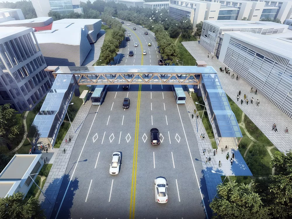 跨越南山區(qū)沙河西路,西接大沖片區(qū),東接沙河西生態(tài)長廊,橋長約113米,橋面凈寬約4.3米,主橋共4跨。天橋設計容景觀、造型、燈光、周邊環(huán)境于一體,設置無障礙觀光電梯,采用鋼箱梁及花崗巖面磚鋪裝、綠化自動滴灌等。天橋的建設將大大縮短居民繞行時間,對完善周邊居民出行環(huán)境具有重要意義。