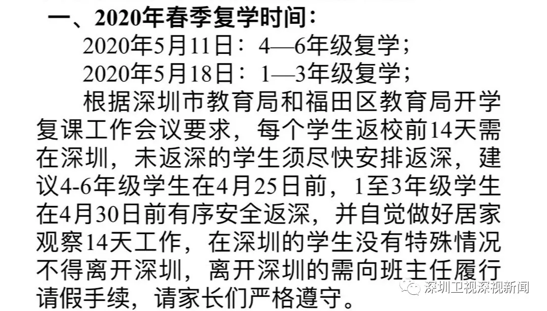 近日,有媒體報道稱,深圳中小學(xué)生返校時間已確定。5月11日安排全市高中、初中其他學(xué)段和小學(xué)4—6年級學(xué)生返校;5月18日安排全市小學(xué)1—3年級學(xué)生返校。