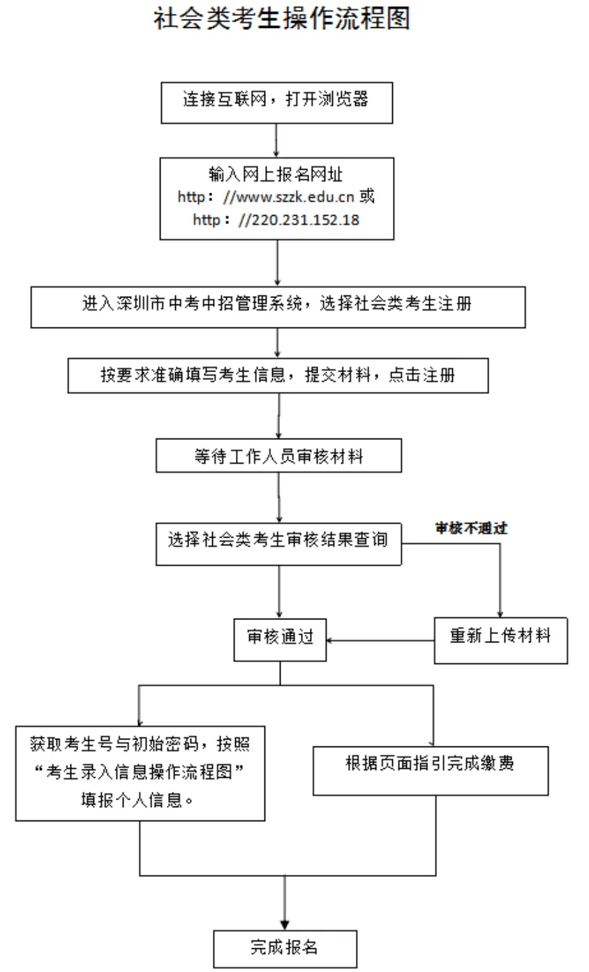 見圳客戶端·深圳新聞網(wǎng)2020年4月30日訊 據(jù)深圳市教育局消息,2020年深圳高中階段學(xué)校招生考試(以下簡稱“中考”)報名定于5月6日-15日進(jìn)行,考試時間為7月20日-21日。 今年本市應(yīng)屆初中畢業(yè)生仍繼續(xù)在就讀學(xué)校集體辦理報名手續(xù)。符合深圳中考報名條件的深圳戶籍往屆生、在市外就讀的深圳戶籍應(yīng)屆初中畢業(yè)生(以下簡稱“社會類考生”)采用網(wǎng)上報名方式進(jìn)行報名。 報名條件 一、具有我市戶籍的初中畢業(yè)生,可以在我市報名參加中考。 二、具有我市初三學(xué)籍的隨遷子女可以報名參加中考,同時符合以下條件的,可以參加相應(yīng)的公辦普高、民辦普高和中職學(xué)校的劃線錄取。 (一)父親或母親在我市具有合法穩(wěn)定職業(yè); (二)父親或母親在我市具有合法穩(wěn)定住所; (三)父親或母親持有有效《深圳經(jīng)濟(jì)特區(qū)居住證》; (四)父親或母親在我市繳納基本養(yǎng)老保險及基本醫(yī)療保險,且至少其中一個險種累計(jì)繳費(fèi)滿3年,社保累計(jì)年限計(jì)算截至2020年8月31日; (五)隨遷子女在我市具有3年完整初中學(xué)籍。 不符合上述條件但具有我市初中學(xué)籍的隨遷子女,可以在我市參加中考,但僅限于參加民辦普高補(bǔ)錄或中職學(xué)校注冊入學(xué)。 三、高中階段學(xué)校在校生不得報名。 本市應(yīng)屆初中畢業(yè)生報名辦法 本市應(yīng)屆初中畢業(yè)生于5月6日至7日在就讀學(xué)校集體辦理報名手續(xù)。 今年中考繼續(xù)實(shí)行網(wǎng)上報名。要求各學(xué)校開放計(jì)算機(jī)房,為本校考生上網(wǎng)報名提供方便。 5月8日至15日,學(xué)校組織考生進(jìn)行電子攝像,學(xué)校和考生分別上網(wǎng)錄入報名信息,考生錄入信息可參考“考生錄入信息流程圖”進(jìn)行操作。 市教育局強(qiáng)調(diào),學(xué)校不得以任何理由拒絕有本校學(xué)籍的應(yīng)屆畢業(yè)生報考(參加中職學(xué)校自主招生、注冊入學(xué)的考生,也須報名參加中考)。如有違反者,將嚴(yán)肅查處,并追究相關(guān)人員責(zé)任。同時要求各區(qū)有關(guān)職能部門、各有關(guān)學(xué)校(報名點(diǎn))要嚴(yán)格審查報名材料。對不符合報名條件、弄虛作假而被錄取的考生,一經(jīng)發(fā)現(xiàn),取消其錄取資格;已經(jīng)到錄取學(xué)校報到注冊的,取消其學(xué)籍,并追究相關(guān)人員責(zé)任。 社會類考生報名辦法 社會類考生采用網(wǎng)上報名方式進(jìn)行報名。報名考生需在5月6日至15日登錄報名網(wǎng)址(http://www.szzk.edu.cn/),按照提示進(jìn)行網(wǎng)上注冊,上傳報名審核資料,由考生戶籍所在區(qū)社會報名點(diǎn)進(jìn)行線上審核,審核通過后系統(tǒng)將生成中考考生號及初始密碼,考生需用獲取的考號及密碼登錄中考中招管理系統(tǒng),填寫個人信息,具體操作可參考“考生錄入信息流程圖”。同時需在報名截止前根據(jù)指引完成網(wǎng)上繳費(fèi)。 若考生網(wǎng)上報名審核不通過,需按照系統(tǒng)的不通過原因提示,重新補(bǔ)充審核資料,如多次上傳資料失敗或?qū)徍瞬煌ㄟ^,考生可撥打戶籍所在區(qū)的社會報名點(diǎn)電話進(jìn)行咨詢或電話預(yù)約,按照工作人員指示進(jìn)行操作報名,不要在未預(yù)約的情況下前往社會報名點(diǎn),盡量避免出行,減少人員聚集。 社會類考生操作流程如下圖: