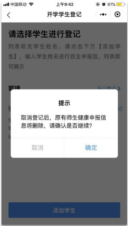②點(diǎn)擊“取消登記”,平臺(tái)彈出提示“取消登記后,原有師生健康申報(bào)信息將刪除,請(qǐng)確認(rèn)是否繼續(xù)?”,點(diǎn)擊“確定”,即取消成功。取消成功后,可重新進(jìn)行開(kāi)學(xué)登記。