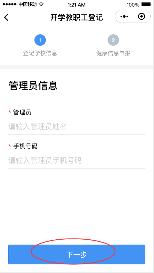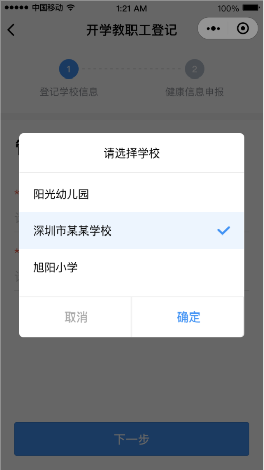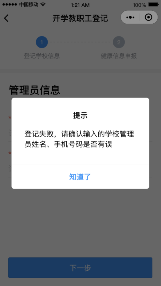 ②點(diǎn)擊“馬上登記”按鈕,填寫學(xué)校管理員姓名和手機(jī)號(hào)碼(學(xué)校管理員姓名和手機(jī)號(hào)碼請(qǐng)?jiān)儐?wèn)學(xué)校獲得)后點(diǎn)擊“下一步”,然后選擇對(duì)應(yīng)的學(xué)校。