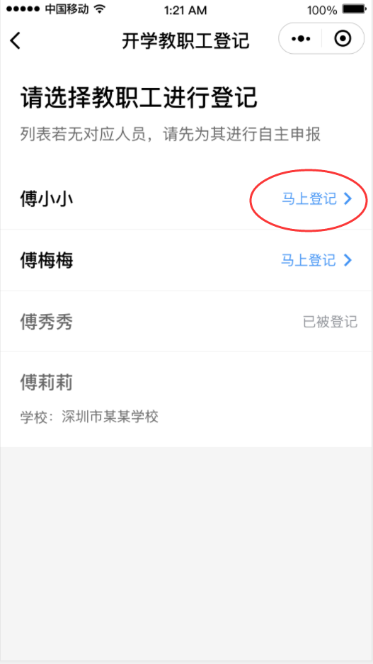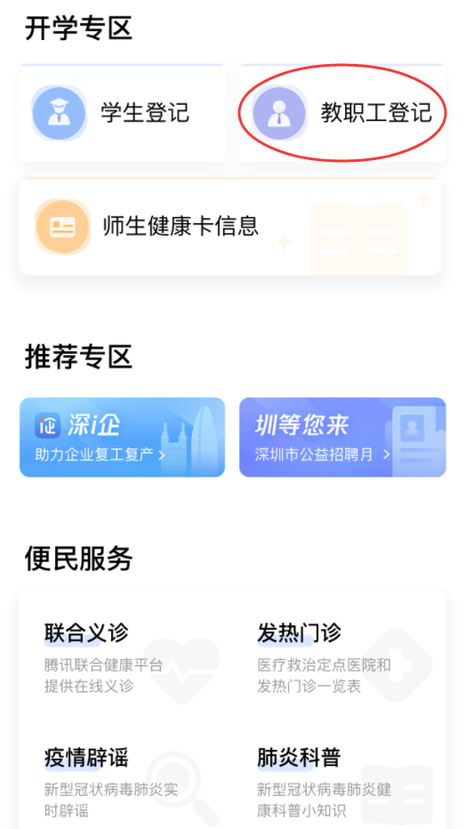①在首頁(yè)開(kāi)學(xué)專區(qū),點(diǎn)擊“教職工登記”進(jìn)入申報(bào)人員列表,進(jìn)行自主申報(bào)和實(shí)名認(rèn)證。