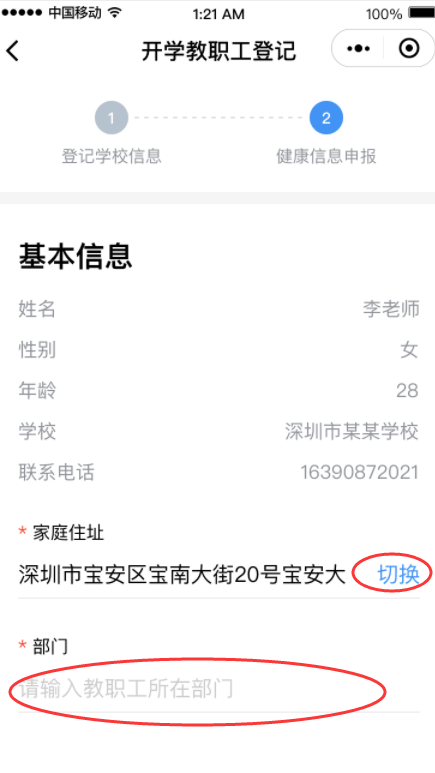 ⑤完成健康信息申報(bào),包括選擇家庭住址、申報(bào)健康情況、填寫監(jiān)護(hù)人姓名等,請(qǐng)勾選申報(bào)承諾,點(diǎn)擊“生成師生健康碼”即可完成健康申報(bào)。