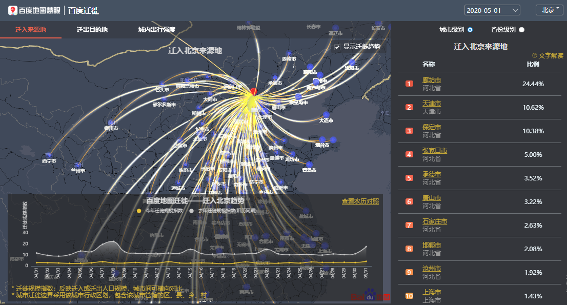 百度地圖遷徙大數(shù)據(jù)平臺(tái)-遷入北京來(lái)源地