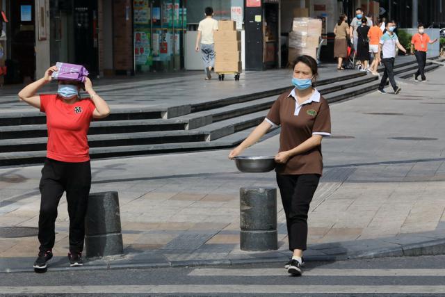 ▲走在街上,熱浪撲面而來(lái),耀眼的陽(yáng)光把人曬得睜不開(kāi)眼,行人紛紛拿起手頭物品遮擋烈日。