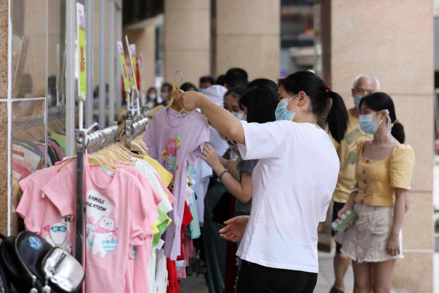 ▲夏季服裝開(kāi)售,不少商家打折促銷,吸引市民選購(gòu)。