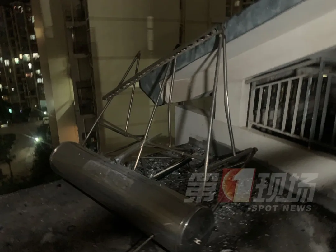 另一個(gè)儲(chǔ)水箱,是從該小區(qū)7棟樓頂?shù)?,剛好掉在該?0層住戶家的上方,現(xiàn)場(chǎng)玻璃碎渣散落一地。