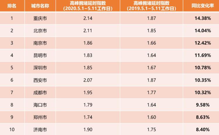 根據(jù)高德地圖監(jiān)測的50個(gè)主要城市交通數(shù)據(jù)顯示,5月1日至11日工作日相比2019年同期,重慶、北京、南京、昆明的高峰擁堵延時(shí)指數(shù)漲幅較大,同比變化率均超過11%,深圳、西安、成都同比變化率也超過10%。