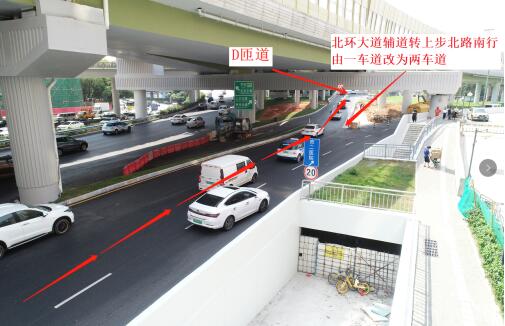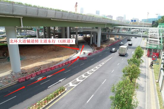 北環(huán)大道主道轉(zhuǎn)上步北路南行路口封閉作應急使用,為緩解輔路壓力,北環(huán)大道輔道轉(zhuǎn)上步北路南行由原一車道改為兩車道,新增的車道于5月18日同步開通。