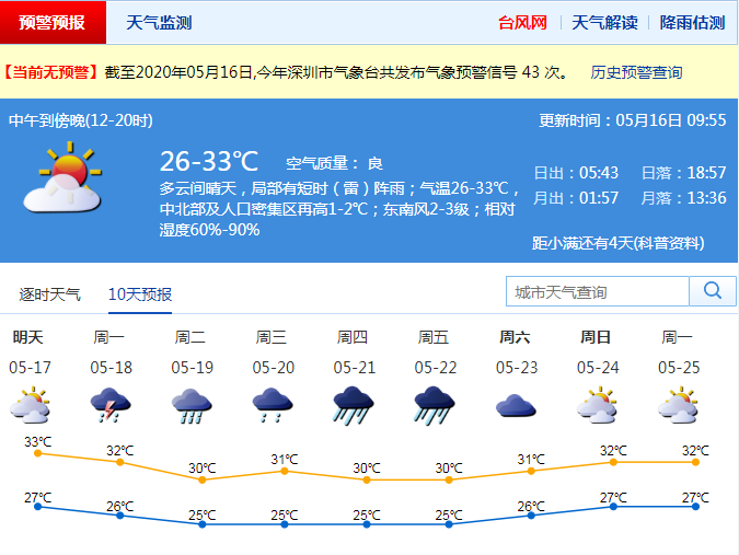見圳客戶端·深圳新聞網(wǎng)2020年5月16日訊 深圳市氣象臺預報,周末天氣悶熱局部有短時(雷)陣雨下周轉(zhuǎn)趨多降雨天氣:周末期間(16-17日)多云間晴天,天氣悶熱,局部地區(qū)有短時(雷)陣雨,氣溫27-33℃,中北部最高氣溫可達35℃左右;下周轉(zhuǎn)趨多降雨天氣,其中18-19日有中到大雨局部暴雨,伴有短時強降雨、短時大風。