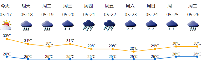 17日白天,粵北市縣、珠三角的部分市縣多云轉(zhuǎn)雷陣雨,其余市縣多云,局部有(雷)陣雨。