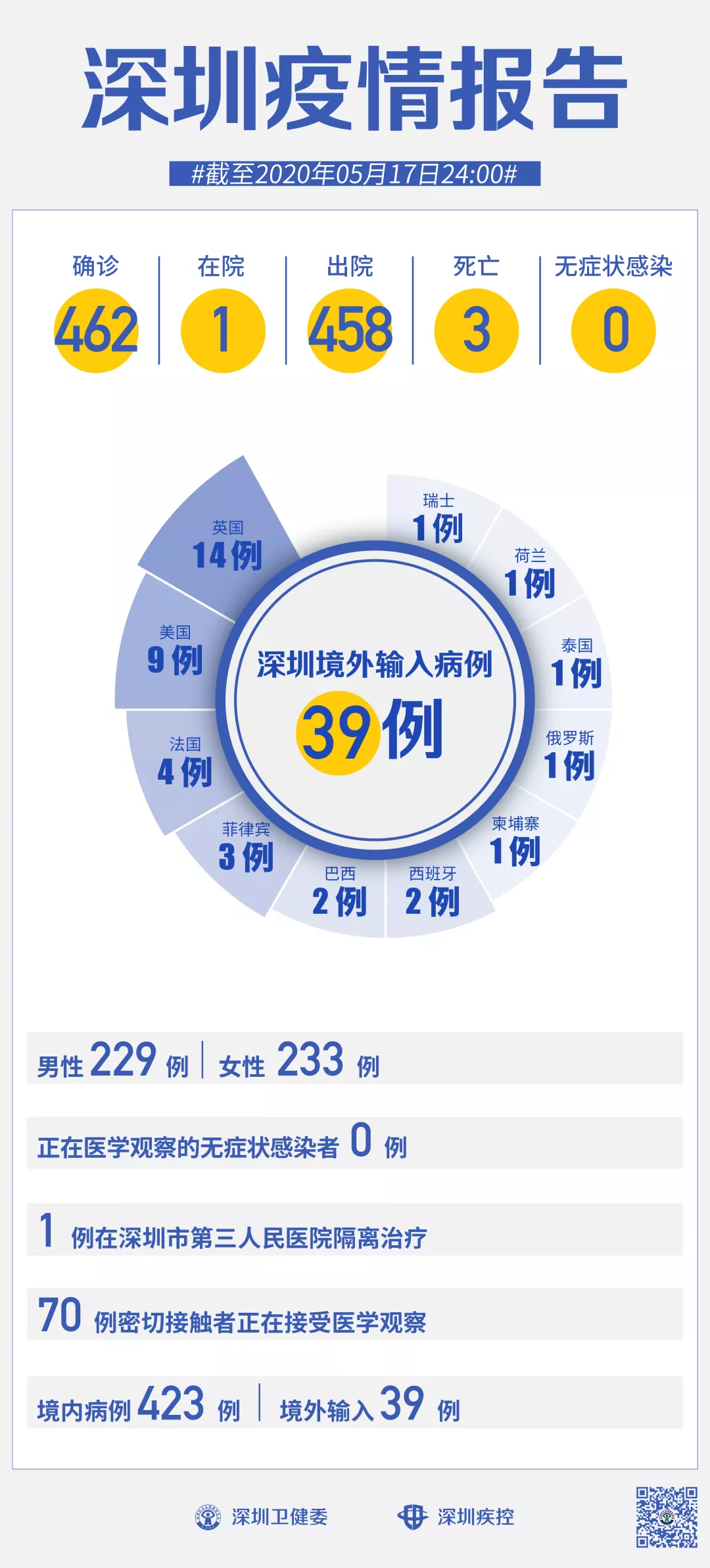 截至5月17日24時,深圳累計報告新冠肺炎病例462例。