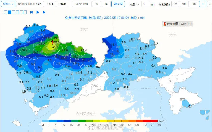 【深圳市分區(qū)暴雨黃色預警】預計福田區(qū),羅湖區(qū),南山區(qū),鹽田區(qū),大鵬新區(qū),西部海區(qū),東部海區(qū),寶安區(qū)(新安、西鄉(xiāng)、航城街道),龍崗區(qū)(南灣、坂田、園山、橫崗、布吉、吉華街道),龍華區(qū)(民治街道)和坪山區(qū)(馬巒、碧嶺街道)1-2小時內(nèi)將出現(xiàn)20-40毫米降水,深圳市氣象臺于2020年05月18日15時50分在上述地區(qū)發(fā)布暴雨黃色分區(qū)預警,全市進入暴雨戒備狀態(tài),請注意防范。