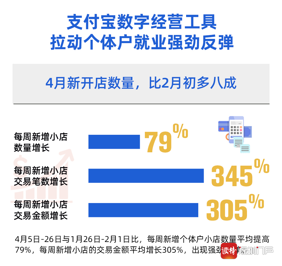 北京大學(xué)數(shù)字金融研究中心通過分析支付寶最新數(shù)據(jù)發(fā)現(xiàn),與疫情中最低點(diǎn)相比,全國個(gè)體戶就業(yè)形勢已出現(xiàn)強(qiáng)勁反彈:隨著復(fù)工復(fù)產(chǎn)的全面推進(jìn)和消費(fèi)券的發(fā)放,4月以來與疫情最低點(diǎn)2月1日當(dāng)周相比,每周新增個(gè)體戶小店數(shù)量平均提高79%,每周新增小店的交易金額平均增長305%。
