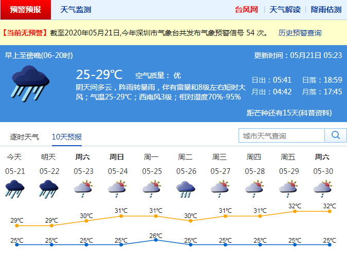 市氣象局預(yù)計(jì),21日凌晨到22日早晨深圳市有暴雨局部大暴雨,并伴有雷暴和8級左右短時大風(fēng),強(qiáng)降水主要影響時段在21日午后至22日早晨;22日白天降水減弱,23日轉(zhuǎn)(雷)陣雨天氣。