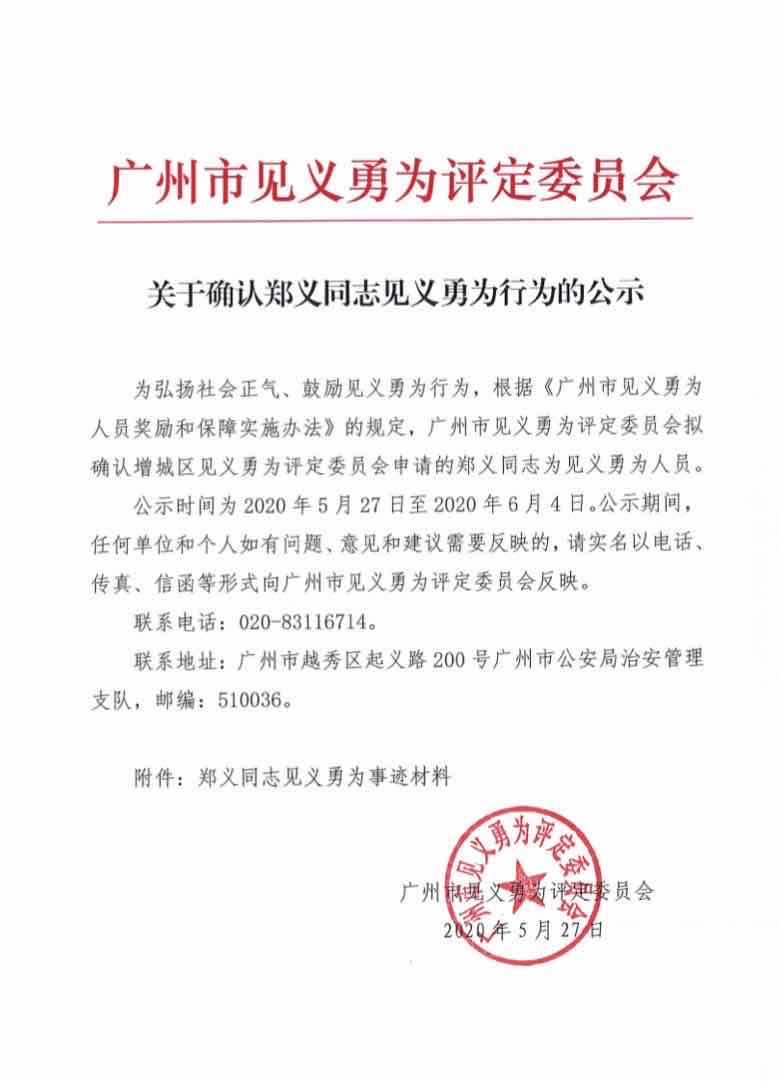 5月27日,廣州市見義勇為評(píng)定委員會(huì)發(fā)出《關(guān)于確認(rèn)鄭義同志見義勇為行為的公示》,擬確認(rèn)鄭義同志為見義勇為人員。