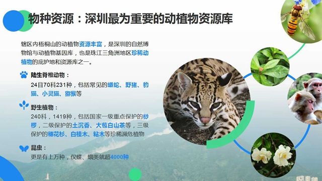 轄區(qū)內(nèi)梧桐山的動植物資源豐富,是深圳的自然博物館與動植物基因庫,也是珠江三角洲地區(qū)珍稀動植物的庇護(hù)地和資源庫之一。經(jīng)調(diào)查統(tǒng)計,有24目70科231種,包括常見的蟒蛇、野豬、豹貓、小靈貓、獼猴等;野生植物240科,1419種,包括國家一級重點(diǎn)保護(hù)的桫欏,二級保護(hù)的土沉香、大苞白山茶等,三級保護(hù)的穗花杉、白桂木、粘木等珍稀瀕危植物;昆蟲更是有上萬種,僅蝶、蛾類就超4000種。