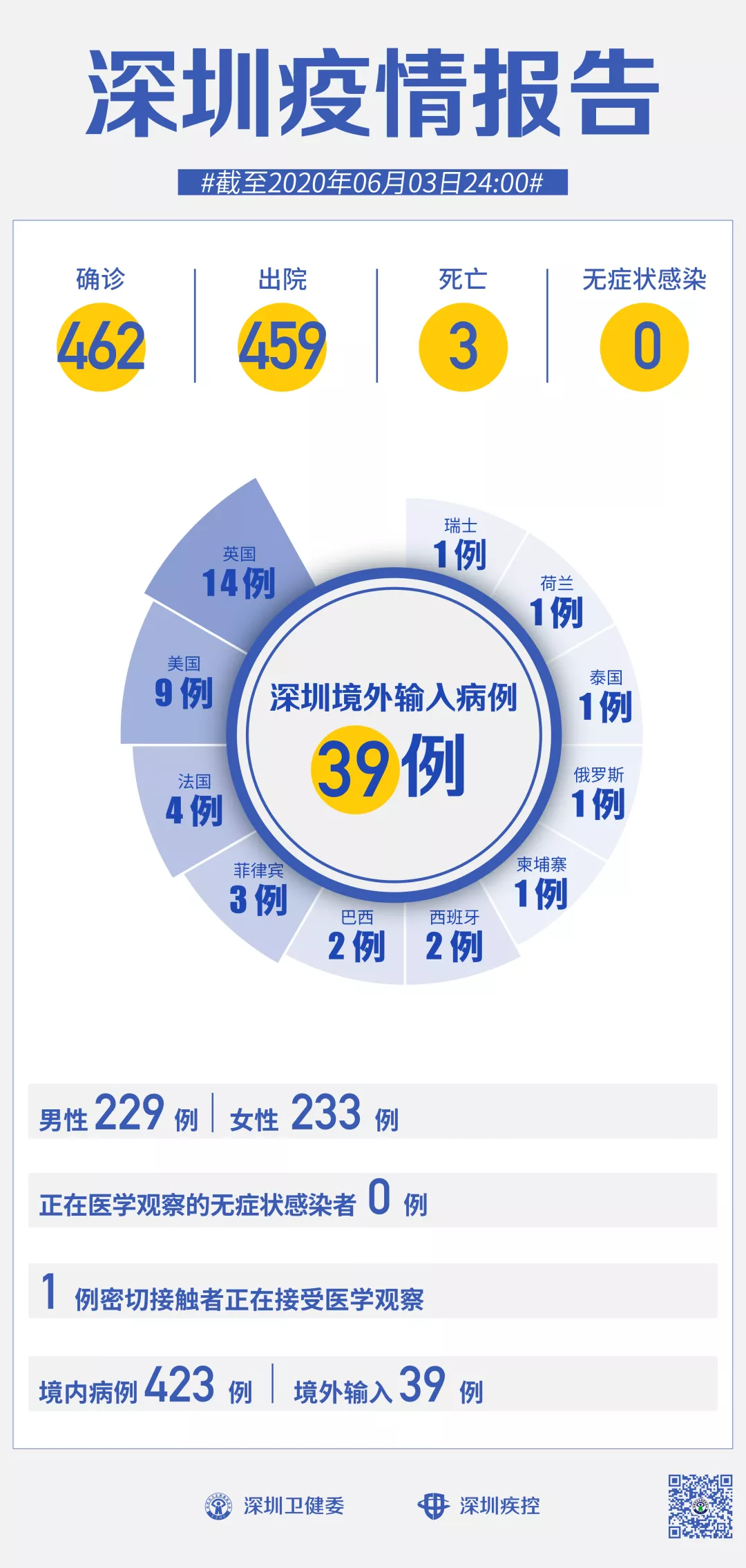 截至6月3日24時,深圳累計報告新冠肺炎病例462例。