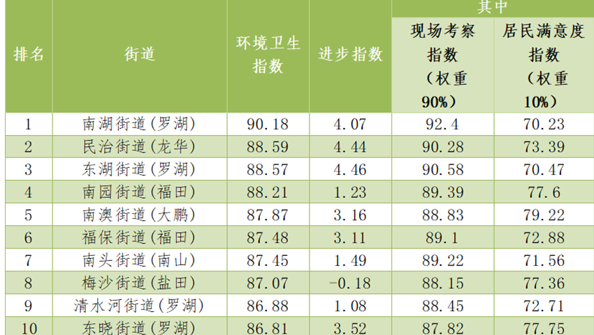 各街道環(huán)境衛(wèi)生進步指數(shù)得分排名第1名的是福田街道(福田),第2名是黃貝街道(羅湖),第3名是東湖街道(羅湖),第4名是翠竹街道(羅湖),第5名是民治街道(龍華)。