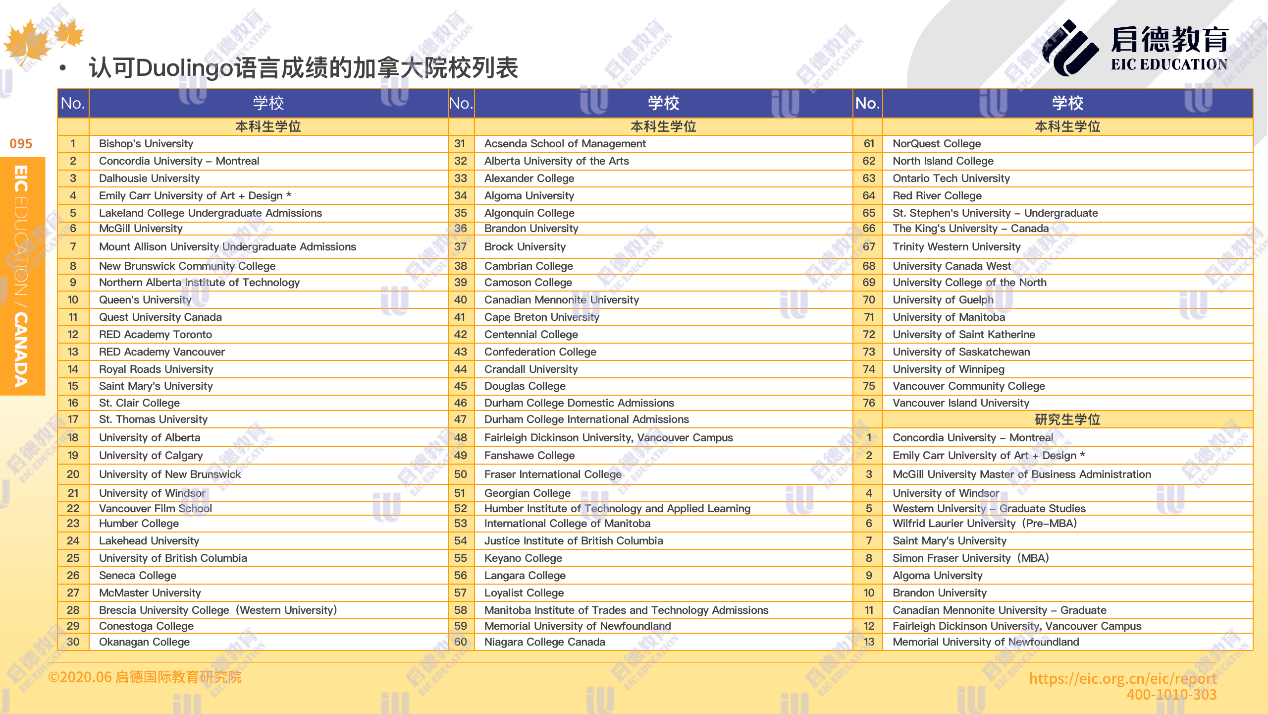 據(jù)了解,目前多鄰國(guó) Duolingo English Test語(yǔ)言成績(jī)被加拿大高校的76個(gè)本科生學(xué)位、18個(gè)研究生學(xué)位,及20所中學(xué)所認(rèn)可。此外,加拿大學(xué)術(shù)英語(yǔ)測(cè)試 CAEL考試已于2019年1月在中國(guó)內(nèi)地開放考試,具有出分快(8天),聽說(shuō)讀寫一次性完成,無(wú)須額外口語(yǔ)面試等特點(diǎn),目前北上廣均設(shè)有考場(chǎng)。