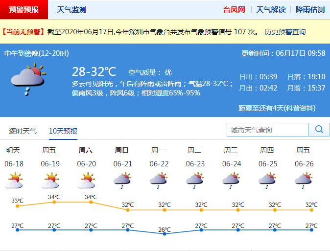 6月17日,深圳多云可見陽光,午后有陣雨或雷陣雨;氣溫28-32℃;偏南風(fēng)3級,陣風(fēng)6級;相對濕度65%-95%