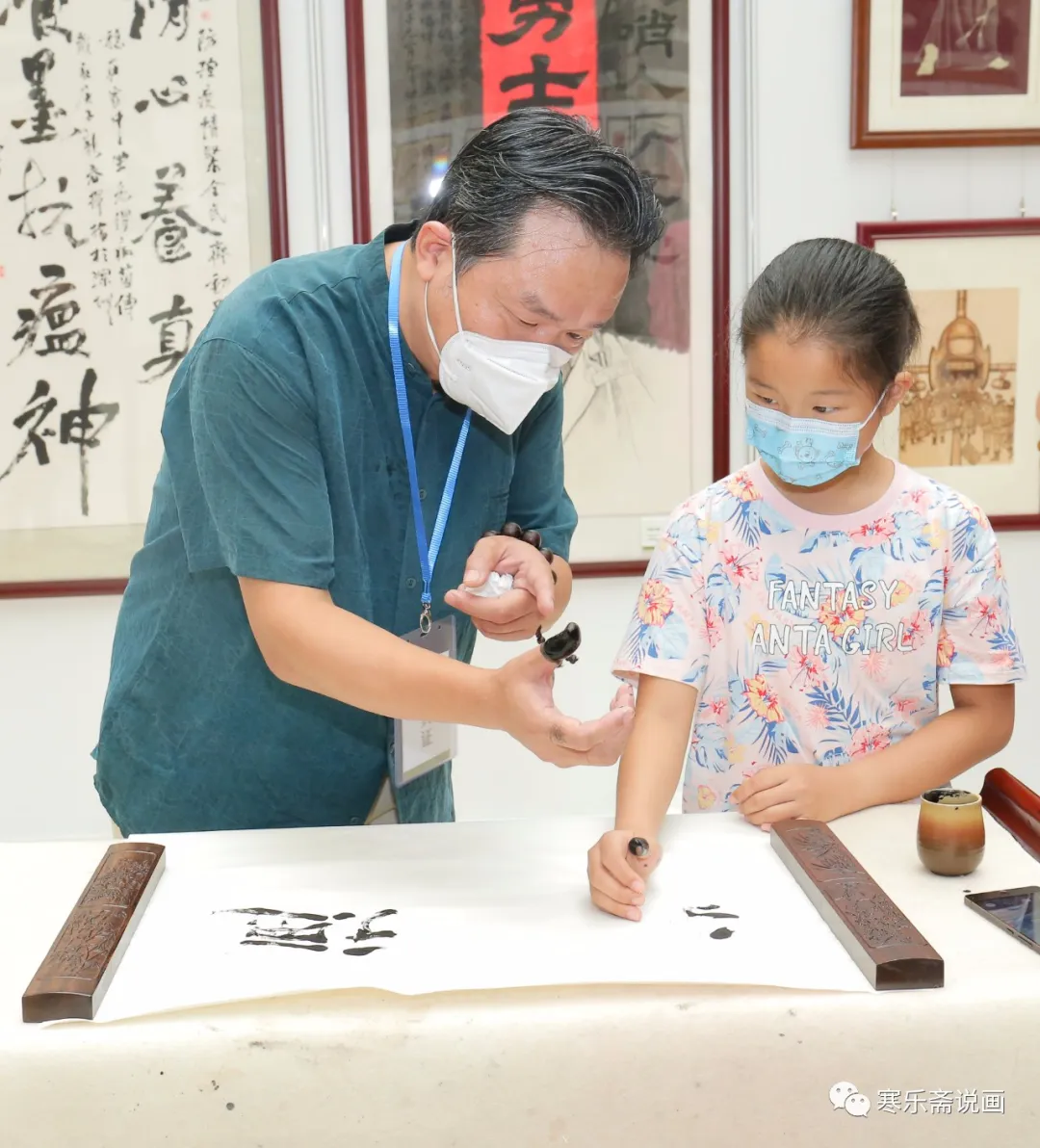 王和平在活動(dòng)現(xiàn)場(chǎng)教授孩子們用手指寫字的要領(lǐng)。