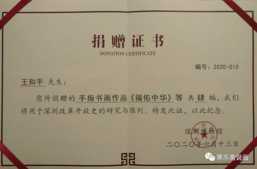 王和平手指書畫作品《福佑中華》等四幅獲得博物館收藏證書。