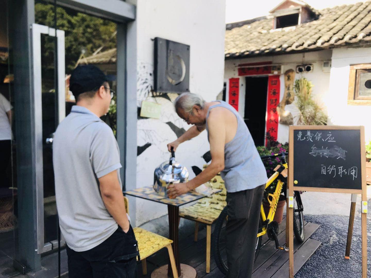 一張桌子、兩把椅子、一壺水就是一個涼茶點,一旁支起的黑板上還寫著“免費供應(yīng)、自行取用”八個字。這里的涼茶從下午三點半開始準時向過往行人免費提供,一直到晚上七八點。愛心涼茶供應(yīng)點的發(fā)起人叫陳小林,熟悉他的人都稱呼他小林哥。