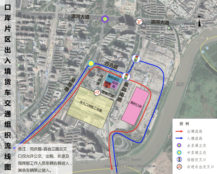 臨時(shí)口岸期間機(jī)動(dòng)車交通按照“流線順暢、客貨分離、人車分離”的原則進(jìn)行組織。主要利用口岸片區(qū)的皇崗路、百合路、福田南路、同慶路等進(jìn)行組織。各交通方式交通組織流線圖如下: