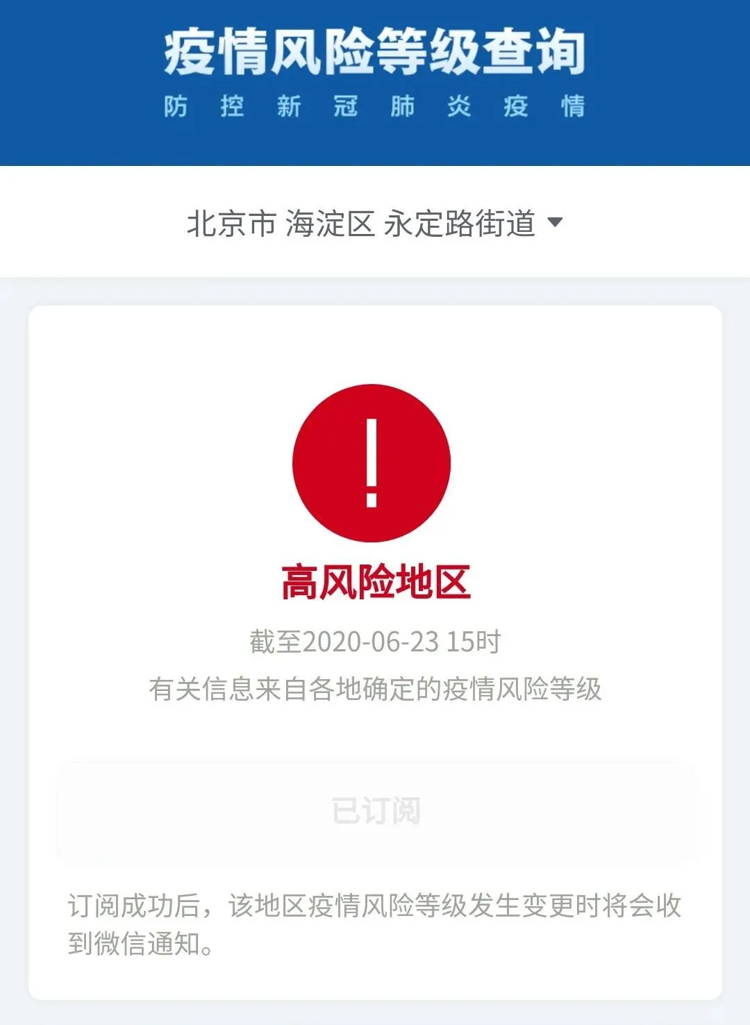 截至6月23日15時,北京市海淀區(qū)永定路街道由中風(fēng)險調(diào)整為高風(fēng)險。