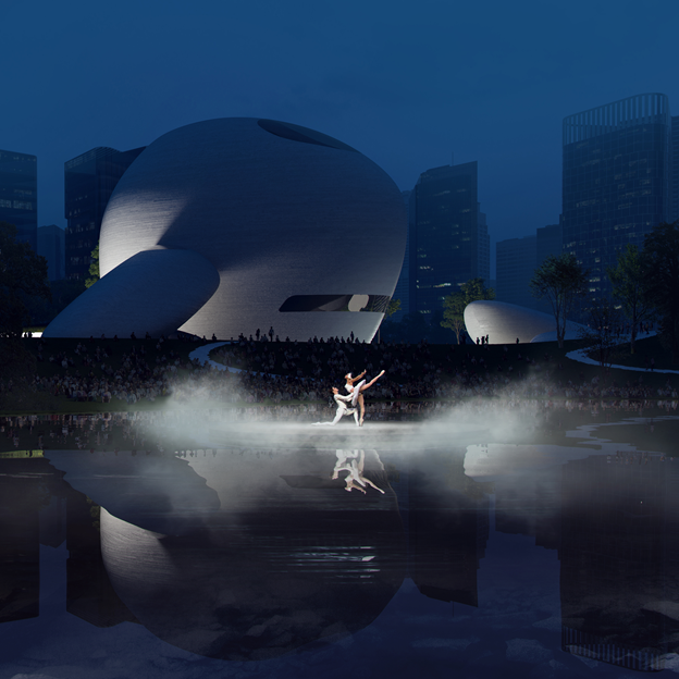 廣場中央的水池,可以作為劇場,容納萬人活動(dòng);景觀中預(yù)留出多處平臺,提供公共藝術(shù)展覽、市集、藝術(shù)節(jié)、音樂節(jié)等戶外活動(dòng)場地;公園將城市的中軸線延續(xù)到海邊,行人步道、自行車道蜿蜒穿梭在建筑和草坪之間,為市民提供海濱休閑場地。