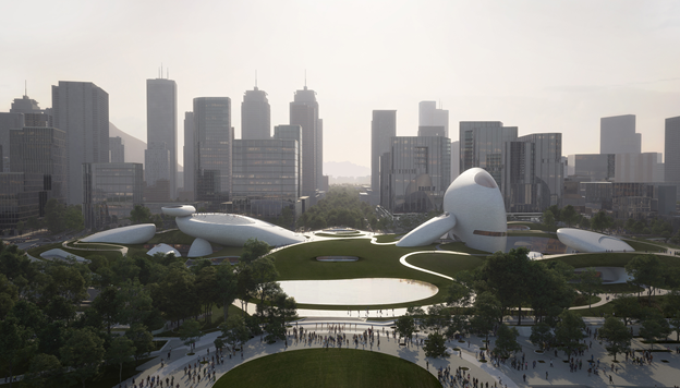 該項(xiàng)目由著名建筑師馬巖松帶領(lǐng)的MAD建筑事務(wù)所負(fù)責(zé)項(xiàng)目方案設(shè)計(jì)。方案顯示,將以“遠(yuǎn)古”和“未來”兩大概念,通過步道串聯(lián)起散落石群建筑、綠地、公共活動(dòng)區(qū),展現(xiàn)原始氛圍與未來力量的結(jié)合。在南館與北館兩個(gè)展館中間設(shè)有架空中軸景觀連橋,其中超高層的石群展廳將打造出炫目的展覽效果。此外,廣場還將連接深圳人才公園,形成一片連續(xù)的開放空間。
