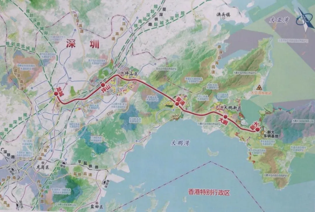 龍崗至大鵬支線:起自龍崗,經(jīng)坪山至大鵬新區(qū),線路與深惠城際、深大城際銜接。