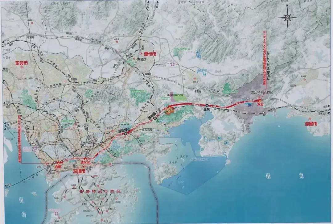 深汕高鐵:起自西麗站,經(jīng)南山區(qū)、羅湖區(qū)、龍崗區(qū)、坪山區(qū)、惠州市至深汕特別合作區(qū)深汕站,銜接廣汕鐵路,全長127公里。