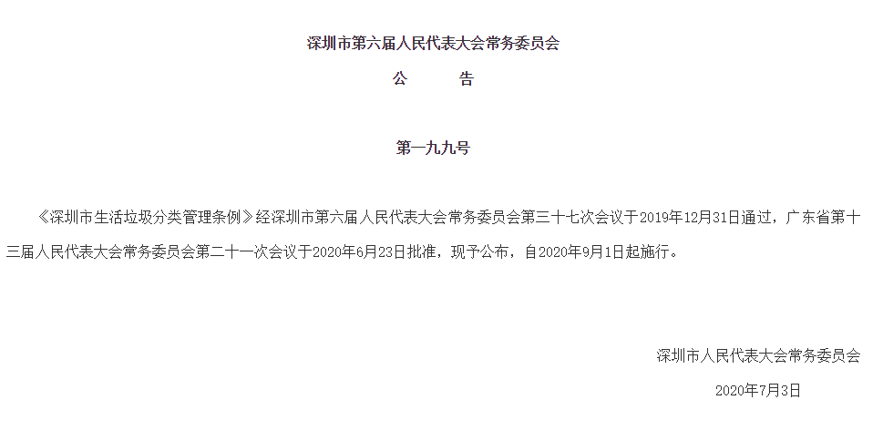 見圳客戶端·深圳新聞網(wǎng)2020年7月4日訊(見圳客戶端、深圳新聞網(wǎng)記者 葉梅)記者從深圳市人大常委會(huì)官方網(wǎng)站獲悉,《深圳市生活垃圾分類管理?xiàng)l例》(以下簡(jiǎn)稱《條例》)經(jīng)深圳市第六屆人民代表大會(huì)常務(wù)委員會(huì)第三十七次會(huì)議于2019年12月31日通過,廣東省第十三屆人民代表大會(huì)常務(wù)委員會(huì)第二十一次會(huì)議于2020年6月23日批準(zhǔn),將于2020年9月1日起施行,從垃圾分類投放、收集運(yùn)輸處理、源頭減量和循環(huán)利用等方面提出了明確要求。