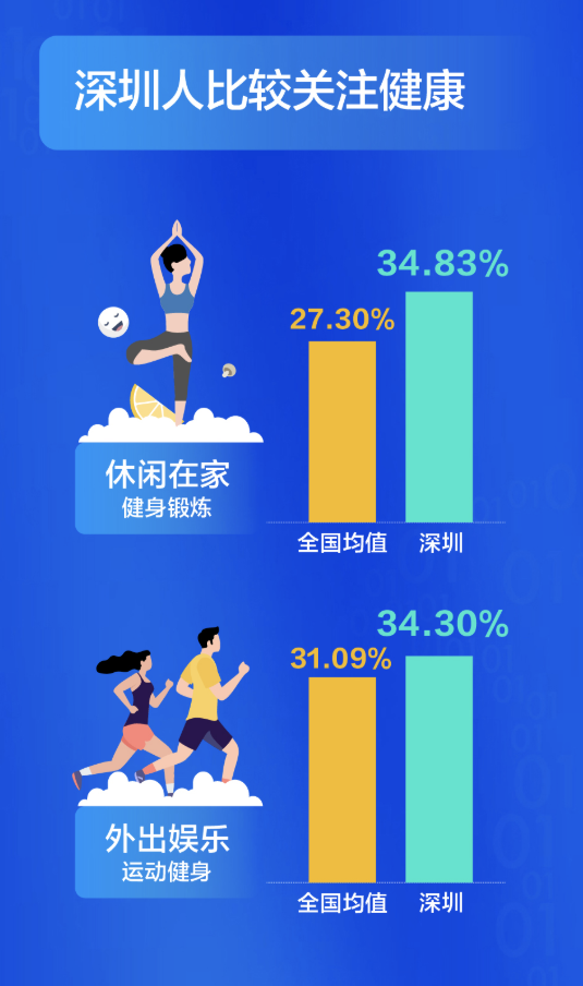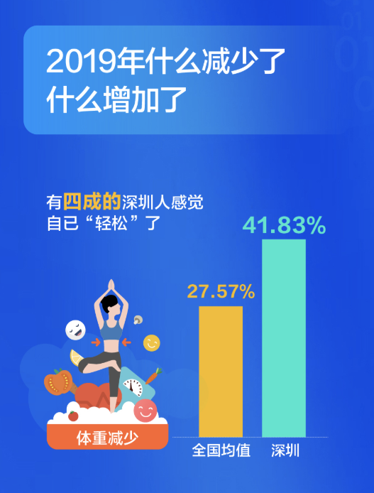 深圳人比較關(guān)注健康,不管是宅在家還是外出娛樂,他們選擇運(yùn)動健身的比例都超過全國平均水平,對健康的投資,成就了又一個(gè)“苗條之城”。過去這一年,有四成的深圳人感覺自已“輕松”了,體重減少的人群比例高出全國近14個(gè)百分點(diǎn)。甩掉了贅肉的同時(shí),深圳人還感覺在時(shí)間、朋友、收入這三方面的收獲在增加。尤其是時(shí)間,超出了全國均值8個(gè)百分點(diǎn)。