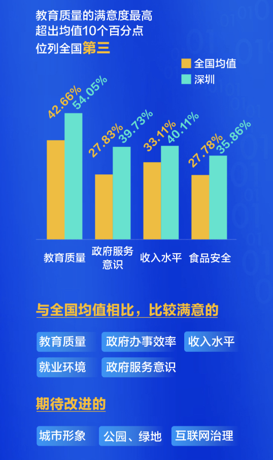 在針對城市治理能力和社會服務(wù)的20多項(xiàng)滿意度指標(biāo)中,深圳有19項(xiàng)高于全國省會城市和直轄市平均水平。其中,市民對教育服務(wù)的滿意度最高,超出均值10個(gè)百分點(diǎn),位列全國第三,其次是治安狀況和水、空氣質(zhì)量,而在政府服務(wù)意識和食品安全的滿意度,也排在全國同類第一名。此外,日常生活中的收入和就業(yè),也讓深圳人感覺比較踏實(shí)。